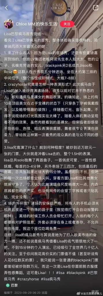 Lisa疯马秀表演时间28号7点28分法国时间有时差6小时左右,国内同步直播预计表演在后半夜2点这样Lisa疯马秀里场照片